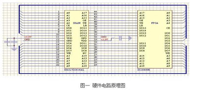 在进行数据存储时,可直接将数据写入FPGA内部的Block RAM中,在一定程度上减少了FPGA的资源分配。但FPGA内部自带的RAM块毕竟是有限的,当需进行大容量数据存储时这有限的RAM块是远远不能满足系统设计要求的。此时,就需要将FPGA与外部RAM相结合完成大容量数据存储。具体硬件电路如图一所示:
