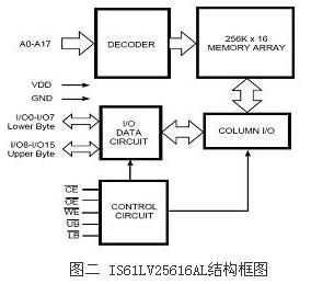 IS61LV25616AL是Integrated Silicon Solution 公司(ISSI)的一款容量为256K×16的且引脚功能完全兼容的4Mb的异步SRAM,可为Xilinx公司的Spartan-2E系列FPGA提供高性能、高消费比的外围存储。除了256K×16异步SRAM外,ISSI还提供128K×16、512K×16、256K×8、512K×8和1M×8的异步SRAM。 IS61LV25616AL引脚结构框图如图二所示: