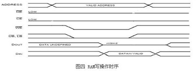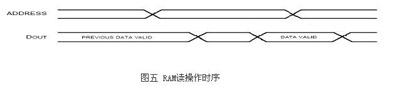 对SRAM进行读操作相对较简单,在进行读操作期间,始终为低电平, 始终为高电平。每进行一次读操作,地址按系统要求变化一次。同时注意,地址的变化时刻总要先于数据的变化时刻。图五为RAM读操作时序。