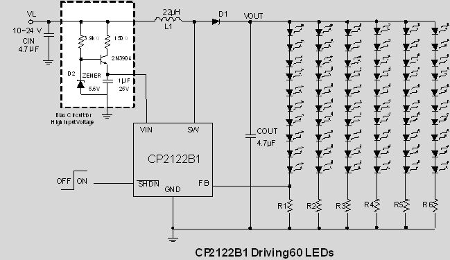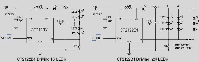 作为恒流驱动白光LED的升压DC/DC转换器件,CP2122B1可驱动3~30颗LED。CP2122B1采用高达1.4MHz的工作频率,允许采用小巧的外部电感和电容元件。LED采用串联的连接形式,这样保证流过每个LED的电流相同,从而可以获得一致的亮度。300mV的反馈电压使得在电流设定电阻上消耗的功率很小,尽可能的优化了在白光LED驱动应用时的效率。CP2122B1的开关管的峰值电流可高达900mA,并且可承受高达38V的电压。 在单节锂离子电池供电情况下,CP2122B1可驱动一串多达10个LED,或7串每串3个LED。随着供电电压升高,CP2122B1可以驱动更多LED,所以非常适合于中大LCD屏的背光应用。CP2122B1内置软启动功能,限制启动时的浪涌电流。