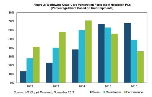 在低价笔记本中,2016年四核四核处理器占有率将从2012年的13%上升到68%。届时,双核低价笔记本的占有率将只有8%。其余的24%份额将由六核与八核处理器占据。搭载六核与八核处理器的低价笔记本不会在2015年以前出现,甚至在更强大的主流与高性能笔记本领域,未来两年才会开始非常缓慢地采用六核与八核处理器,到2015和2016年才会占据较大的份额。