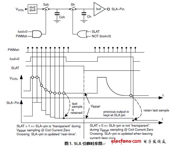 为了将采样的BEMF输出电平适应到(0 V至5 V)范围,采样的线圈电压Vcoil可选择被除以2或4。此设定通过SPI位来控制。下图显示了SLA引脚的工作,透明位“PWMsh”及“Icoil=0”是内部信号,与SLAT一起定义线圈电压的采样以及维持瞬间。