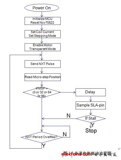 当系统上电时候,微控制器就会初始化,NCV70522复位。这些动作完成时,线圈电流及步进模式将被设定。然后电机驱动器将启用。NXT脉冲将被发送实现转动电机。电机转速等于NXT脉冲频率乘以步进细分模式的值。图3是流程图。