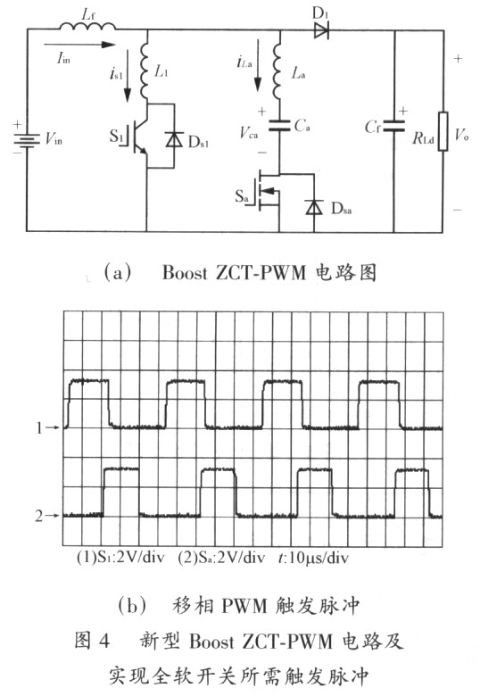 1)针对主、辅开关管均实现软开关的新型Boost ZCT—PWM电路[图4(a)]需要的两路移相PWM触发脉冲,用C8051单片机产生了所需触发脉冲[图4(b)],并对此Boost电路作了实验。单片机端口J/0为低电平有效,故图4(b)所示是经非门反相后的信号。实验电路参数:Vin=24V,Vo=48V,输出功率100W,Lf=5mH,L1=4μH,La=6μH,Ca=1μF,Cf200μF。实验结果如图5所示。