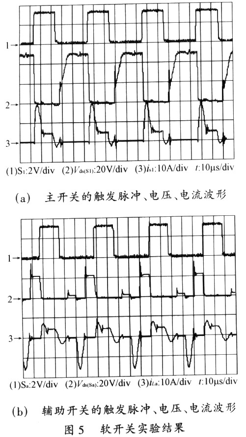 从图5实验结果可见,主、辅开关管均实现了零电流开通和关断,表明单片机产生的移相PWM触发脉冲能保证电路实现预期的全软开关效果。