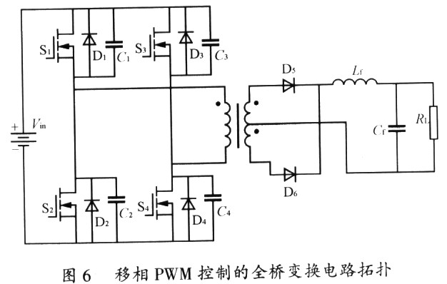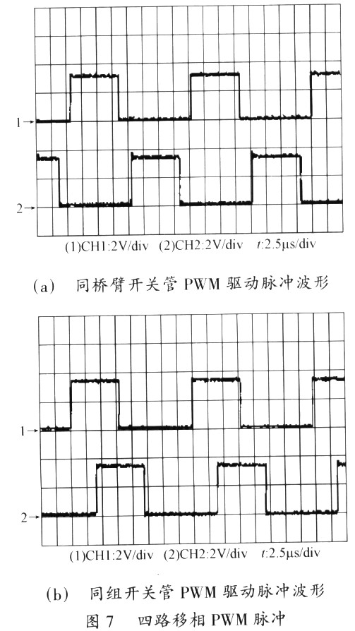 2)专用移相控制芯片如UC3879,在软开关全桥PWM变换器(如图6所示)中有很广泛的应用。本实验实现单片机输出4路PWM脉冲,频率为50kHz,每路占空比为40%,同一桥臂开关管死区时间设定为2μs,桥臂S1、S4为一组,S2、S3为一组,实验结果如图7所示。