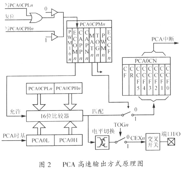 图1为PCA原理框图,以C8051F040为例,PCA包含1个专用的16位计数器/定时器和6个16位捕捉/比较模块。从图1中可见,16位PCA专用计数器/定时器的时基信号可有多种选择,可通过配置相关的系统控制器的特殊功能寄存器(SFR)来实现。每个捕捉/比较模块有自己的I/O线CEXn,可通过配制交叉开关寄存器(XBR。)将每个模块的I/O线连接到端口I/0;每个模块都可配制为独立工作,有4种工作方式:边沿触发捕捉方式、软件定时器比较方式、高速输出和脉宽调制器。本文中产生多路占空比不等的移相PWM是使用了捕捉/比较模块的高速输出工作方式,其原理如图2所示。