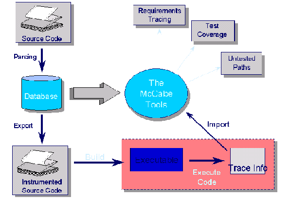 另一款集成阶段测试工具是McCabe Test。正如前一部分提到的,它可很直观从整体上把握软件的结构,生成集成测试Plan,通过插装被测试软件,得到被插装后的源代码。运行目标编译器,最后并测量覆盖率。McCabe自动跟踪软件执行,得到测试信息,产生覆盖率报告。
