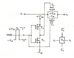 图1为CMOS模拟开关电路原理图。它克服了NMOS模拟开关电路Ron虽vI增大而增大的缺点,扩大输入信号幅度的范围;而且可以在CMOS电路基础上增设辅助电路,消除NMOSFET的衬底效应对Ron的影响。