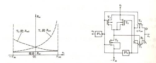 图1 CMOS开关Ron与vI的关系 图2 含辅助电路CMOS开关电路