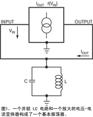 设计师尝试用许多电路拓扑来实现这些设计目标,有些还是非常复杂的,但有一种有源器件的基本特性能够帮助设计师从一个简单振荡电路那里获得可接受的性能。图 1 显示的是一个基本 LC 振荡器配置。放大器作为一个非反相的压控电流源运行。LC 电路将放大器的输出电流 IOUT 转换为电压 VIN,并将其加到放大器的输入端。公式 1 示出了振荡的有效条件:
