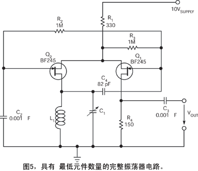 Q1的栅源结点对调谐电路上的交流电压V22进行整流。图5中的耦合电容器C4是图3中直流恒压电容器CS的两倍,因为它的基电极通过调谐线圈 L 的低直流阻抗接地。DC控制电压通过电阻器R2驱动Q2的栅极。电容器C2将Q2的栅极接地,提供交流信号通道,而Q2工作在共栅连接下,因为Q1的源极驱动Q2的源极。为减少由于负载变动导致的频率变化,与 Q1 漏极串联的一只相对较小阻值的电阻器 R4,将输出与电路的频率确定元件隔离开来。另外,L 和 C 的一个引脚接地。