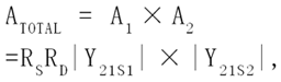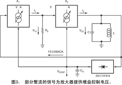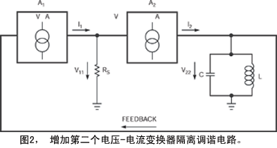 图 2 所示是另一种振荡器拓扑,它采用两只级联的非反相放大器,A1 和 A2,作为电压-电流变换器(压控电流源)。在电路中,耦合电阻器 RS 将放大器 A1 的输出电流 IIN 变换为电压 VIN,并驱动第二级 A2。调谐电路的动态电阻将 A2 的输出电流变换为输出电压 V22,并将其反馈至 A1 的输入端,完成正反馈回路。公式 2 是总环路放大率 ATOTAL: