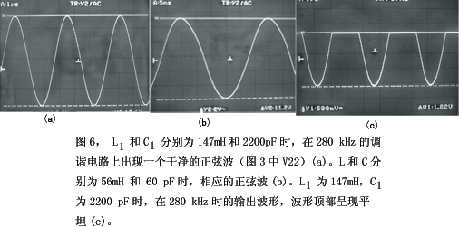在地电势下,VOUT平坦部分,即顶部的 DC 电平复位,由于负供电电压的原因,波形为负值。由于自动增益控制的作用,波形保持着明显的一致性,而与频率无关,在 25 MHz 以上频率时有些微的圆形拐角,主要原因是杂散电容引起的。只有 LC 电路的非接地端才产生一个完美的正弦波。由于两只晶体管主要工作在 B 类方式,其电压和电流波形都有截止失真,当供电电压升高时,工作状态向 C 类转化。你可以从 LC 电路中直接提取出正弦波,但负载阻抗的变化会影响工作频率。