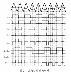 如图3所示本文采用的是用等腰三角波来实现双边调制。国外许多高频链设计中通常采用的是锯齿波实现单边调制,其直边用于同步开关时序,斜边用于脉宽调制,而在实际应用中,这种方法存在锯齿波的直边不能完全垂直而带来的开关时序同步问题。本文所采用CPLD进行时序设计的方法,从根本上解决了开关时序同步的问题。4设计中应该注意的几个问题