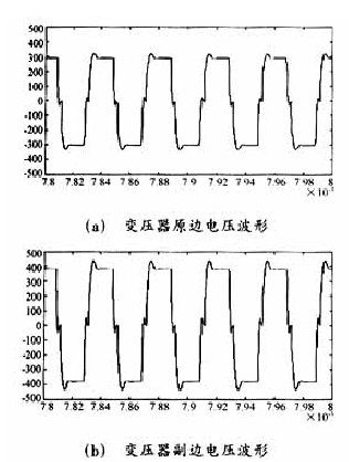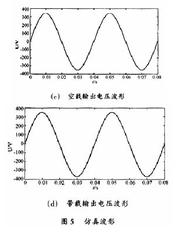 本文利用MATLAB61提供的SIMULINK工具包对整个系统建立了仿真模型进行仿真。仿真模型参数:输入直流电压300V,输出交流电压220V,25Hz,额定容量1000VA,开关频率25kHz,变压器变比1/1.4,输出滤波电感L=0.5mH,输出滤波电容C=20μF,额定负载R=45Ω。仿真波形如图5所示。