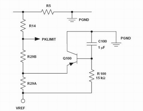 从 VREF 到 PKLIMIT 的电阻 R29 被分为 R29A 和 R29B 两部分。这两个电阻值之和为被分解之前的原电阻值,即与 VREF 连接的电阻为原电阻值的1/3,与 PKLIMIT 连接的电阻为原电阻的 2/3。所添加的 PNP 信号晶体管 (Q100) 的发射极与这两个电阻的交叉点相连,而该晶体管的集电器则连接至接地。晶体管基极与所添加的电阻器 (R100) 与电容器 (C100) 的交叉点相连。所添加电容器的另一侧接地,而电阻器的另一侧连接至 VREF。R12a 与 R12b 之间的比率可以确定当电容器被完全充满时晶体管处于关闭状态。