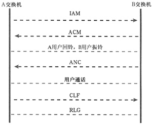 PSTN电话通过No.7信令来建立连接过程,通常采用G.711的PCM编码格式传输,传输速率64 kbit/s。PSTN网络通话流程如图2所示。在PSTN通信过程中,A交换机首先通过发出IAM发起呼叫,其中包括被叫号码。B交换机确定被叫空闲后发出ACM地址全信号通知A,此时B交换机通过A交换机对主叫用户发送回铃音,B交换机向被叫用户振铃。被叫摘机后,B交换机发ANC计费应答信号通知 A,振铃和回铃停止,双方用户开始通话。通话结束后主叫用户先挂机,A交换机 发出CLF前向释放信号通知B,B收到后拆线并发出RLG释放监护信号通知A 交换机。