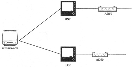 下一代媒体网关系统主要由媒体网关、媒体网关控制器和信令网关组成,实现了功能上的分解。为了适应不同的网络,本文主要介绍了媒体网关的实现方法,其中媒体网关的主要作用是实现模拟信号由电路交换转换成数字信号PCM编码,并进行G.711或者G.723等格式编码。为了实现媒体网关,整个系统由3部分组成,包括基于ARM架构的嵌入式系统(uClinux)、语音信号转换芯片(TLC320AD50)和定点数字信号处理器(TMS320VC54xx),如图3所示。