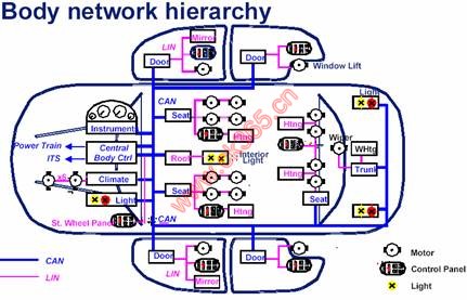通过上图可以看到,蓝色较粗线代表CAN总线,它连接了传动装置控制单元、灯控单元、门控单元、座椅控制单元以及仪表盘控制单元等等。红色较细线代表LIN总线,由LIN总线构成的LIN网络作为CAN网络的辅助网络,连接了车窗控制单元、雨刷控制单元、天窗控制单元等低速设备。