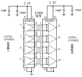 图2是采用MAXIM公司的一片MAX9123驱动器和一片MAX9122接收器设计的一个4通道LVDS点对点连接的单工接口。该接口工作电源为+3.3V,驱动器输入和接收器输出数据为LVTTL/LVCMOS电平。