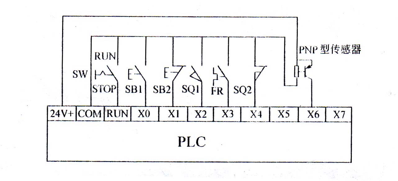 输入回路的连接的示意图如图1-1所示。输入回路的实现是COM通过具体的输入元件(如按钮、转换开关、行程开关、传感器等)连接到对应的输入点上,通过输入点X将信息送到PLC内部。