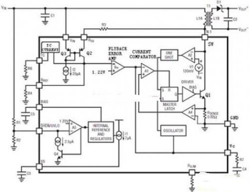 另外若新增变压器或变压器绕组,无形就会使变压器物理尺寸变大,成本增加,其动态响应也不怎么样好。而LT3573则无需外接光电耦合器件或第三绕组,其特有的内置反激误差放大器,在二次侧绕组电流为零时,反激误差放大器开始取样输出电压信息,直接从变压器原边的反激电压波形检测输出电压的变化信息,自动维持输出电压的稳定性,这也是此IC设计的亮点之所在。反激电压由于RFB和Q2的作用,变换成电流,这个电流几乎全部流过电阻RREF,形成反馈电压,进入反激误差放大器,并与其1.22V的参考电压进行比较,以便后续电路能调整开关管的占空比,达到稳定输出电压的目的,如图1所示。