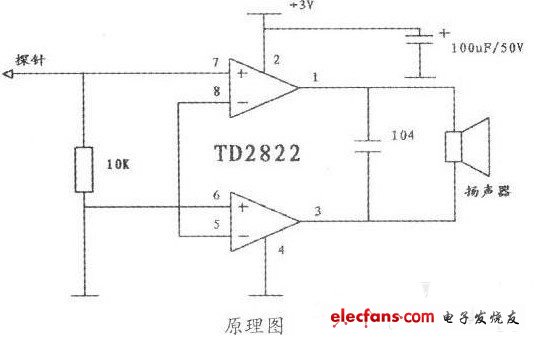 音频信号通过探针被送入功率集成块TD2822,将微弱的音频信号进行放大,放大过后通过1、3脚输出,驱动扬声器发声。在这里扬声器体积要非常小。
