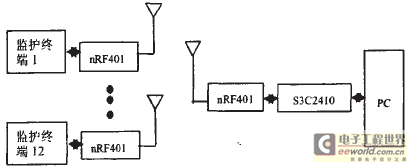 无线收发模块采用Nordic公司研制的单片UHF无线收发芯片nRF401,该芯片工作在433MHzISM(Industrial,scientific and Medical)濒段。该频段无需申请许可证。并采用FSK调制解调技术,抗干扰能力强,并采用PLL频率合成技术,频牢稳定性好,数据传输速率可达20kbDs,传输距离可达1000m,完全满足本设计所需要的通信距离要求。不同于其他的RF单片芯片,nRF401通过单片机串口直接于MCU通信,而无需对数据进行曼彻斯特编码,这使的nRF401的外围元件很少,只包括一个基准晶振和几个无源器件,具有成本低、一致性好等特点。本设计中,nRF401直接与S3C2410A的串口1连接。