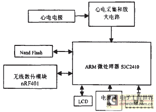 系统硬件设计包括中心监护端的硬件设计和监护一个床位的各个心电监护终端的硬件设计两大部分。中心监护端的硬件设计包括S3C2410A与PC机的连接和nRF401与S3C2410A的连接。由于S3C2410A具有USB设备控制器,因此可通过USB口与PC机相连,并得到5V的T作电压。无线收发芯片nRF401直接与S3C2410A的串口1连接。图2为监护一个床位的心电监护终端硬件电路的结构框图,包括ARM微处理器S3C2410A、心电放大及采集电路、外部扩展的Nand FLash存储器、电源、LCD显示、键盘和nRF401尤线数传模块等。