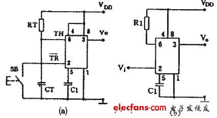 将555电路的6、2脚作为两个控制输入端,7端不用,就成为一个R-S触发器。注意两个输入端的触发电平和阈值电压不同,如图6(a)所示,有时可能只有一个控制端,这时另外一个控制端要设法接死,根据电路要求可以把R端接到电源端,如图6(b)所示,也可以把S接地,用R端作输入。
