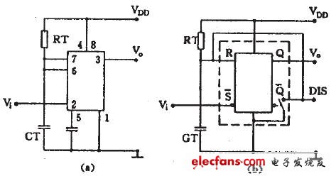 将555电路的6、2脚并接起来接在RC定时电路上,在定时电容CT,两端接按钮开关SB,就成为人工启动型555单稳电路,如图4(a)所示,用等效触发器替代555,并略去与单稳工作无关的部分后见图4(b)所示,下面分析它的工作原理: