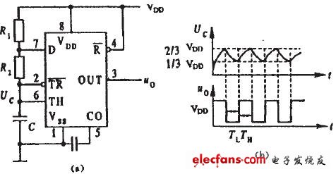 接通电源后,电源VDD通过R1和R2对电容C充电,当Uc<1/3VDD时,振荡器输出Vo=1,放电管截止。当Uc充电到≥2/3VDD后,振荡器输出Vo翻转成0,此时放电管导通,使放电端(DIS)接地,电容C通过R2对地放电,使Uc下降。当Uc下降到≤1/3VDD后,振荡器输出Vo又翻转成1,此时放电管又截止,使放电端(DIS)不接地,电源VDD通过R1和R2又对电容C充电,又使Uc从1/3VDD上升到2/3VDD,触发器又发生翻转,如此周而复始,从而在输出端Vo得到连续变化的振荡脉冲波形。脉冲宽度TL≈0.7R2C,由电容C放电时间决定;TH=0.7(R1+R2)C,由电容C充电时间决定,脉冲周期T≈TH+TL。