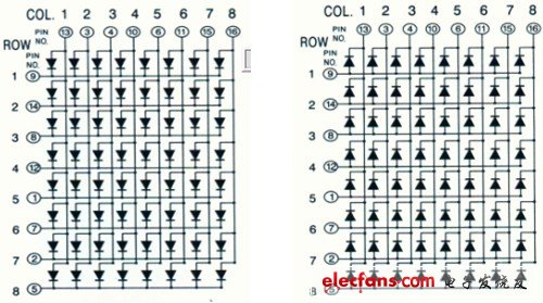 点阵屏有两个类型,一类为共阴极(左),另一类则为共阳极(右),下图给出了两种类型的内部电路原理及相应的管脚图。