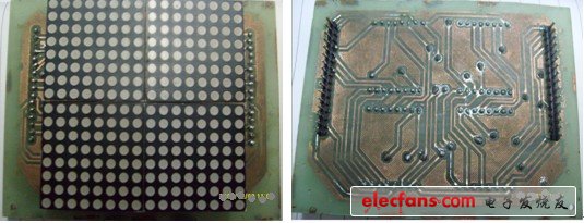 把显示屏电路和显示屏驱动电路分别做在两块电路板上,显示屏电路的行扫描信号输出管脚和列显示信号数据输出管脚分别引用两排16针的排针引出,排针长的那一头接到电路板的底层,以方便插入驱动电路的插槽中。同样在驱动电路用两排16脚的插槽将行扫描信号输出管脚和列显示信号数据输出管脚引出,在画PCB时应当注意屏电路PCB中两排排针之间的距离要与驱动电路PCB中两排插槽之间的距离一样,才能保证能正确地将显示屏电路板排到驱动电路电路板上方。以下为该电路的实物图与PCB。