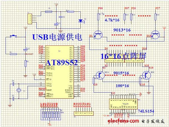 该部分电路主要由AT89S52和74LS154组成。单片机的P0和P2号控制显示信号的输出,P1号的低4位控制74LS154的译码输入,从而控制扫描信号的输出。