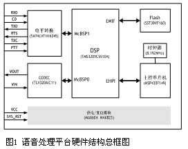 本语音信号处理平台需要考虑以下几个方面的设计要求。在运算量方面,本平台上运行的几种语音编码算法都具有比较高的运算复杂度,经过CCS的仿真测试结果表明,至少要求DSP芯片有50MIPS的处理能力。在接口设计方面,搭载本声码器模块的通讯平台定义了如表1所示的接口管脚,其中VIN和VOUT分别连接到通讯平台的话筒和听筒上的输入和输出话音,PTT连接到话筒的按钮上,按下PTT表示请求通话。TXD和RXD分别是发送和接收的数字语音码流信号,RTS和CD分别是发送和接收码流指示,为低电平的时候表示码流有效。TXC为系统的同步时钟。在功耗方面,由于是手持式设备,要求采用低功耗设计,以延长电池的使用时间。另外,设计系统的安全性也是一个需要考虑的因素。