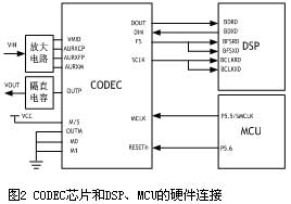 语音CODEC芯片和DSP、MCU的硬件连接图如图2所示,[5]TLV320AIC11是德州仪器公司生产的一款语音CODEC芯片,其片内集成了一个A/D和一个D/A模块,并且有内置的运算放大器,因此仅需要很少的部件就可以将无源话筒和听筒连接到AIC11上。同时,由于它可以和TI公司的DSP无缝连接。如图所示,本次设计中AIC11工作在主模式下(M/S=1),在这个模式下,芯片的采样率为SCLK脚输入的时钟频率的1/256。SCLK脚输入的时钟来源于MCU的P5.5,这个管脚是MCU的副时钟输出为MCU主时钟的1/4。由于MCU工作在4.096MHz,因此CODEC的采样频率为8KHz。AIC11以8KHz的频率在FS上发出同步脉冲,并在DOUT脚上将16bit的PCM数据流发送到DSP。同时从DIN管脚接收DSP发送过来的经过解码的16bit PCM语音。由于使用了AIC11,系统的使用“粘合逻辑”部件大大减小,从而有效的缩小了硬件电路板的面积。