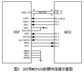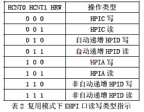 图3是MSP430和DSP之间的硬件连接示意图[3]。如图所示,这种连接方式将DSP和MCU配置成了16位复用连接模式(HMODE=0),数据和地址共享HD总线。HRW、HCNTL0和HCNTL1的不同组合分别表示对DSP的EHPI口的三个寄存器HPID(数据)、HPIA(地址)、HPIC(控制)读写,具体的组合方式如表2所示。