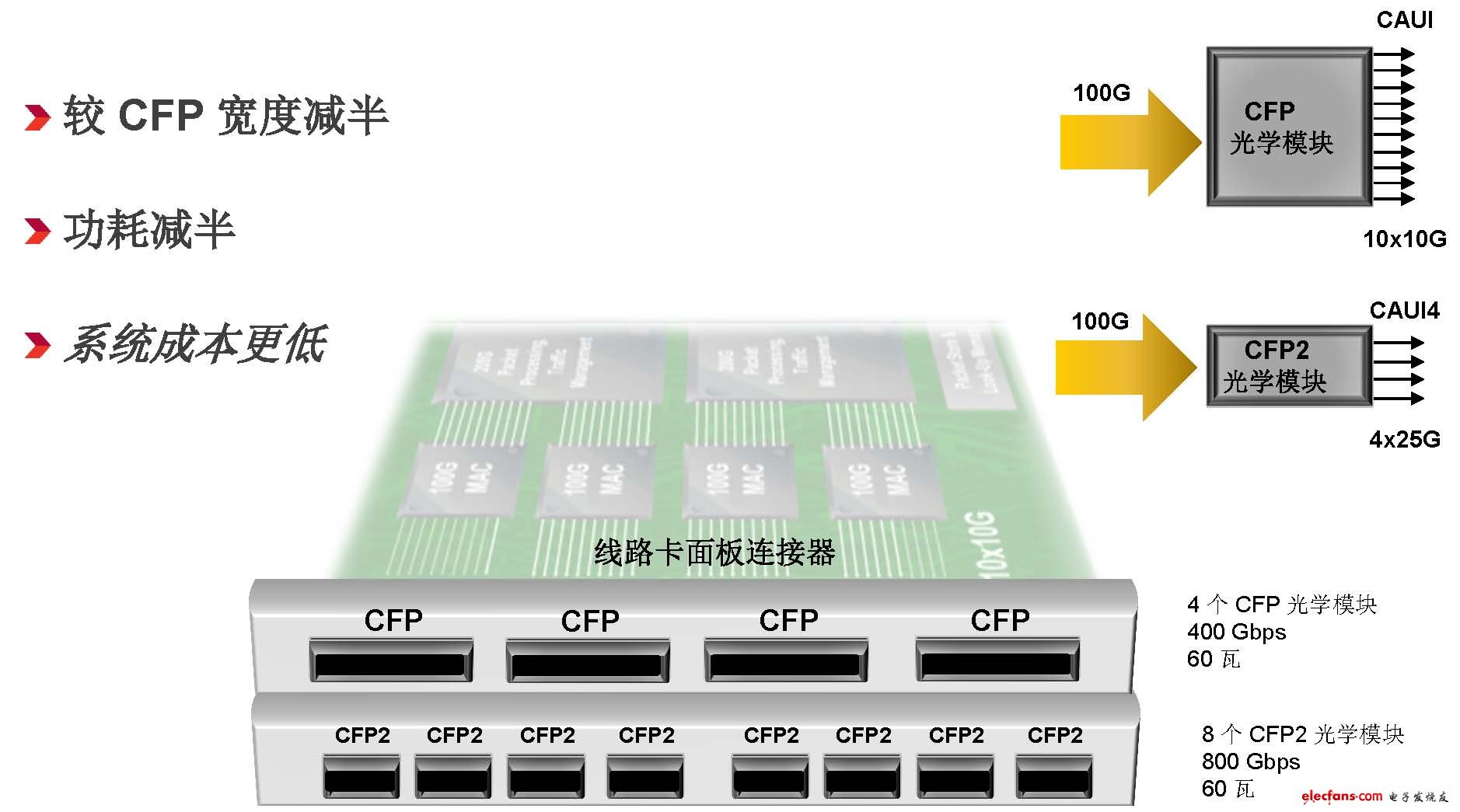 通信设备OEM厂商面临着加倍设备密度,同时确保功耗不变,降低成本的压力。相对CFP光学模块而言,CFP2光学模块可支持下一代100-400Gbps系统的设计,最大化面板带宽密度,同时又不增加尺寸和功耗。