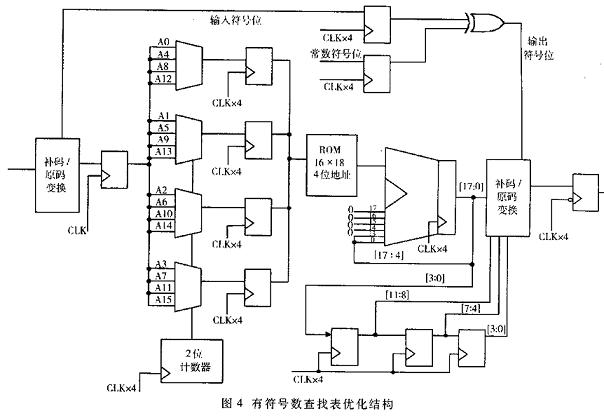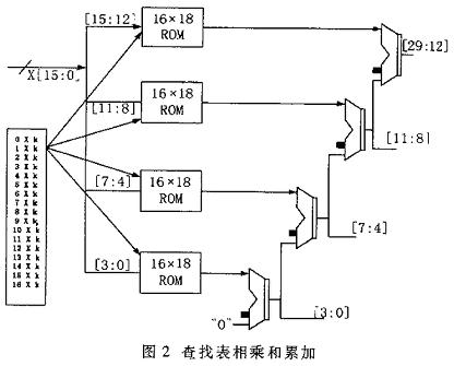 在这种结构中,时钟是f1,内部操作的时钟是4×f1,其中的4个多路复用器每次可以从16路信号中选出4位用作ROM的地址线。每次4位地址从ROM中读出数据,经过相应的移位相加即可,两位计数器用来控制这些多路复位器的输出。