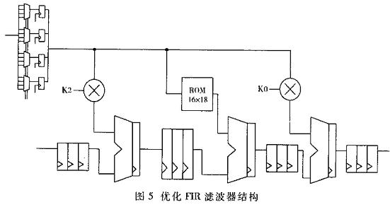 为了有效地利用资源,先通过多路复用器将输入的序列复选出来,这样所有常数乘法器可以共用一个多路复用器,然后通过ROM查表方法实现常数乘法器。优化后的原理结构如5所示。