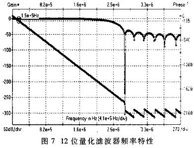 由于在数字滤波器中,各节系数字长有限,所以还要对计算出来的实系数进行量化处理,即浮点数向定点数转换。系数量化后的频域特性如图7所示,量化字长为12。