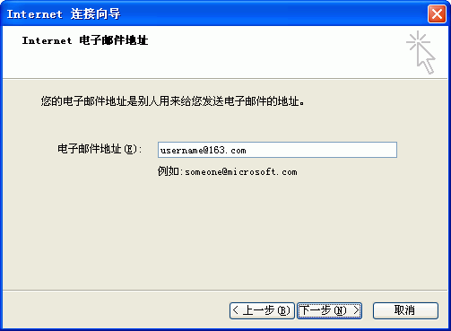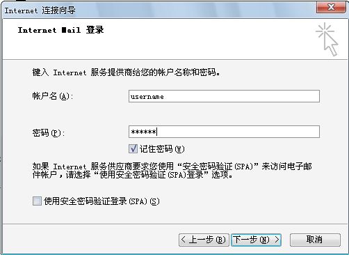 4.在“帐户名:”字段中输入你的163免费邮用户名(仅输入@ 前面的部分)。在“密码:”字段中输入你的邮箱密码,然后单击“下一步”。