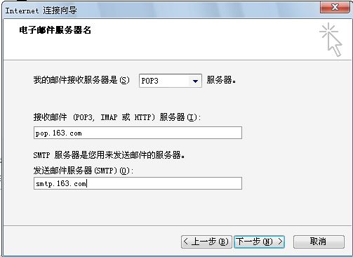 3. 在“接收邮件(pop、IMAP或HTTP)服务器:”字段中输入 pop.163.com。在“发送邮件服务器(SMTP):”字段中输入smtp.163.com,然后单击“下一步”;