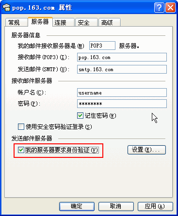 7.在属性设置窗口中,选择“服务器”选项卡,勾选“我的服务器需要身份验证”。