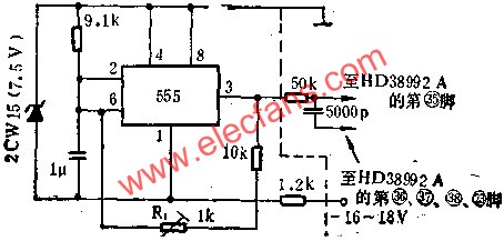 图示线路用555接成50HZ的脉冲振荡器,可代替电源的工频信号.R1为微调电阻,可调节振荡频率,控制时钟走时的快慢.