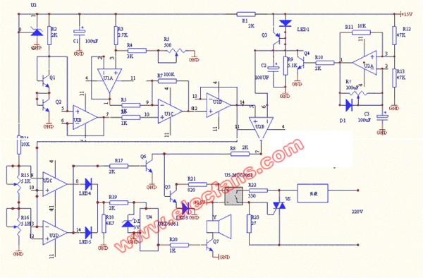 U1A,U1B的接入是为了便于调试并使差分放大器的输入阻抗尽可能平衡。Q1、Q2的be结串联作为温度传感器,由精密稳压集成电路U3(TL431)提供约2.5V的高稳定基准电压源为传感器及窗口电压比较器(U2C,U2D)和差分放大器(U1C)提供合适的参考基准输入。电压跟巡器U1D起缓冲隔离作用,分别将经U1C差分放大器放大后的温差电压Vd送到电压比较器U2B的同相输入端上,U2C的反相输入端接在由U2A等组成的锯齿波电压发生器的输出端上,在锯齿波电压低于Vd期间,U2B输出高电平,Q5饱和导通使接口电路U5得到输入电流信号,其输出端触发双向可控硅VS在市电过零时导通。负载得电工作而发热。培养箱内温度升高,LED3为一绿色高亮度发光二极管,其作用有三:1,为抵消因Q6可能出现的饱和压降过大而使Q5在超温时不能可靠的截止。因负载得电工作发热,培养箱内温度升高,与设定点的温度差减小,从而引起U1C输入的差分电压变小,U1C输出变小,U1D输出(Vd)亦变小,(在一个锯齿波周期内)U2B输出高电平时间减少,以致于培养箱内温度上升速度减慢,当培养箱内温度达到设定温度(37℃)时,此时,温差最小,Vd此时亦最小,负载得电时间最短。以致于培养箱内温度基本上无变化,负载所发热量与培养箱与环境热交换所散发的热量相当,从而维持培养箱内温度稳定在设定温度上。由于负载工作时间长短与温差密切相关(温差大时,Vd大负载得电工作时间就长产热量多,反之,负载工作时间就少,产热也少),而且传感器的输出经约100倍放大从而使得本电路的灵敏度和控制精度都比较高。基本上没有明显的温度阶跃。U2C,U2D为一窗口电压比较器,当培养箱内温度低于设定的报警下限温度时,U2C输出高电平,黄色发光二极管LED4被点亮,表示欠温状态,同时为报警声源集成电路U4提供工作电源使U4工作输出音频信号经Q7放大推动扬声器发声报警;而当某种原因使电路失控而致培养箱内温度升高超过设定报警温度的上限温度时,U2D输出高电平,一路使红色发光二极管LED5发光指示出超温状态,并为报警电路供电是扬声器发声报警;与此同时,经R17使Q6饱和导通,迫使Q5截止,切断U5的输入电流,使VS关断。负载失电停止工作以防培养箱内温度继续升高从而保护了培养箱内的培养物的安全。2,作为加热工作状态指示灯用; 3,防止电路可能出现误动作.