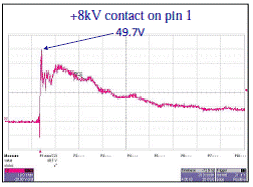 这种实验方法可精确地模拟在一次ESD静电放电事件后印刷电路板所承受的电压值。在这些条件下,在8kV静电放电后,输出电压测量值为50V,这是目前最低的钳位电压,因此是ECMF当前市场上最安全的CMF滤波器+TVS瞬变电压抑制解决方案。
