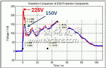 谈到ESD保护问题,有一个重要因素需要注意,当施加静电放电脉冲时,直接连在保护电路后面的被保护芯片不能接受过高的电压,这个参数被称为钳位电压。